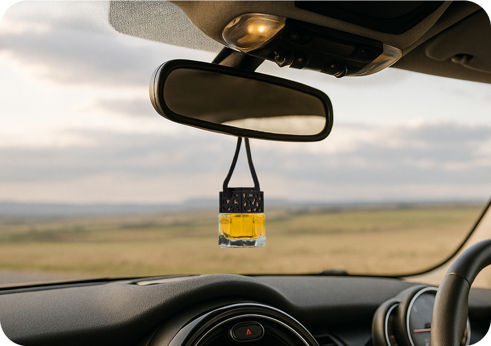 Ein eleganter Autoduft mit Parfüm und nachfüllbarem Holzverschluss.